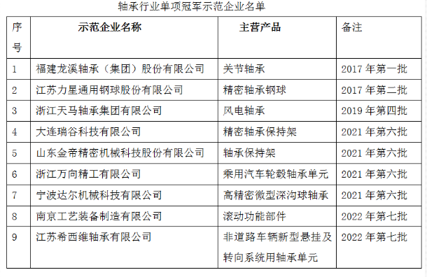 軸承行業(yè)已有14家企業(yè)被認定為單項冠軍企業(yè),其中9家為示范企業(yè),5家為單項冠軍產(chǎn)品企業(yè)。